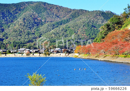 滋賀県 海津大崎桜並木紅葉とマキノ町の町並み