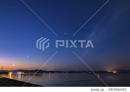 瀬戸内の星景色 惑星大集合と有明月 2022/5/28 4時