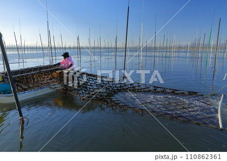 沈みゆく夕日が美しい有明海での海苔養殖の作業風景
