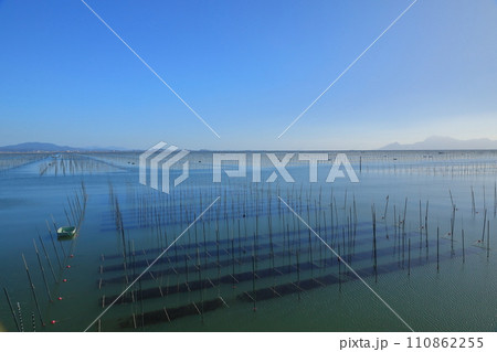 海上に養殖の海苔が浮かび上がる有明海の海苔養殖場の景色