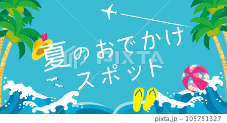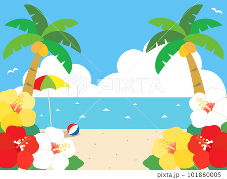 ハイビスカスと海や入道雲などの真夏のビーチをイメージしたイラスト