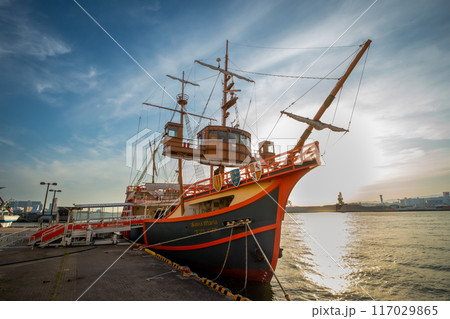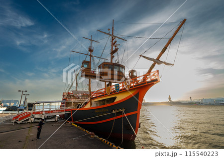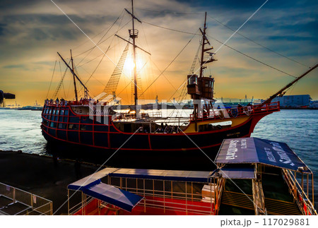 帆船型観光船と夕焼け、5月17日、大阪港西はとば、日本