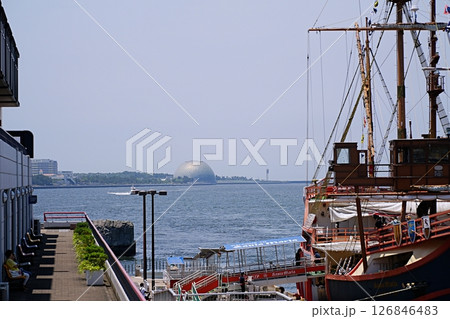 海遊館より見る大阪港の夕景、帆船型観光船入港、5月17日、日本