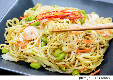 塩焼きそば、海鮮エビ焼きそば、塩やきそば。海老、ニラ、人参入り。