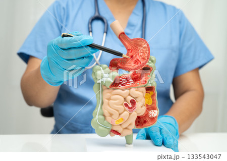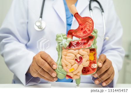 Intestine, doctor holding human anatomy model for study diagnosis and treatment in hospital.