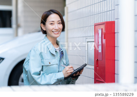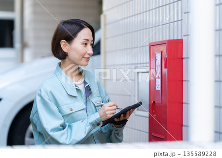 消火器の点検をする作業服の女性 ビルメンテナンス イメージ