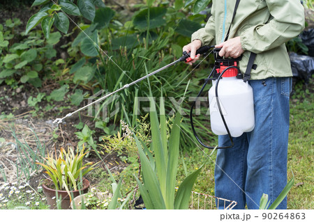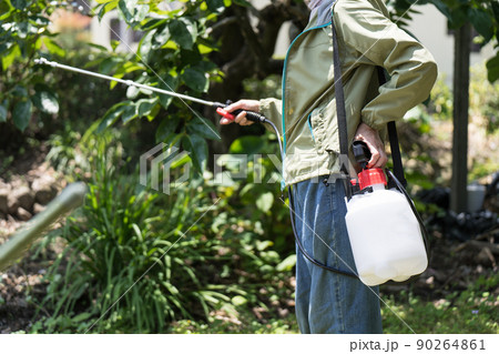 噴霧器で庭木の消毒をするシニア女性の作業員