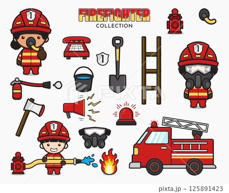Set collection of cute firefighter and equipment cartoon icon clipart illustration
