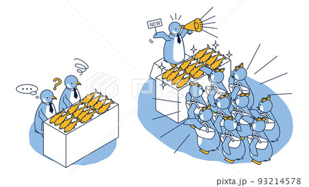 マーケティングのAIDMA(認知、興味、欲求、記憶、行動)を表すペンギン