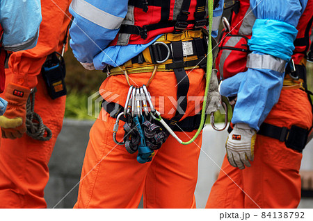 ロープなどフル装備で救助訓練を行うレスキュー隊員