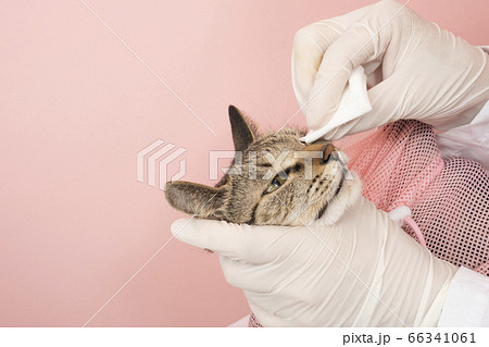 猫の目の周りを拭く獣医の手元