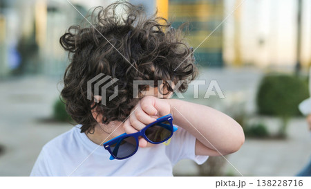 Upset child rubbing eye with hand while holding sunglasses outdoors