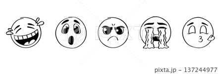 Doodle emoji face set in sketch linear style. Hand-drawn outline round characters with various expressions featuring laugh, wonder, anger, tearful, amorous mood. Vector black white linear illustration
