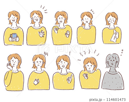 シニア女性の表情、喜怒哀楽セット、線画