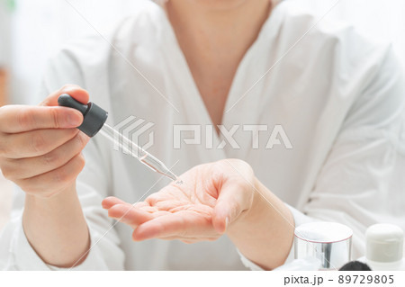 Female hands with cosmetic oil. Anti aging serum with collagen and peptides in glass bottle. Natural beauty products. Mineral organic oil.