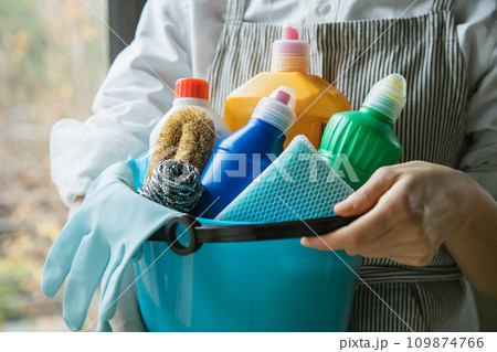 バケツに入った掃除道具を持つ女性 お掃除のイメージ素材