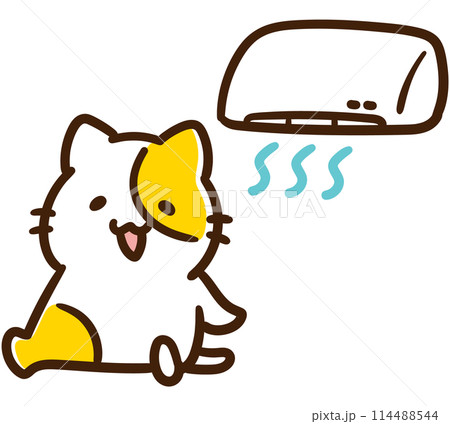 クーラーの冷風で涼むかわいいねこのキャラクターのデフォルメイラスト