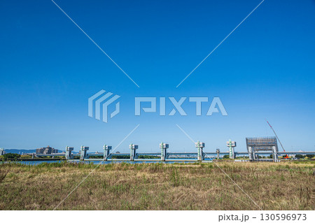 淀川大堰と淀川河川公園の風景