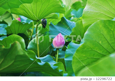 夏の花・・葉の海から顔を出す蓮の蕾・緑の葉バック1輪横位置