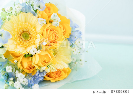 黄色いバラとガーベラのブーケ 花束の写真素材