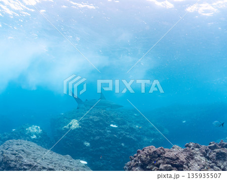 巨大なネムリブカとロウニンアジ。美しいサンゴ礁と熱帯魚の群れ。 沖縄県島尻郡慶良間諸島座間味島嘉比島