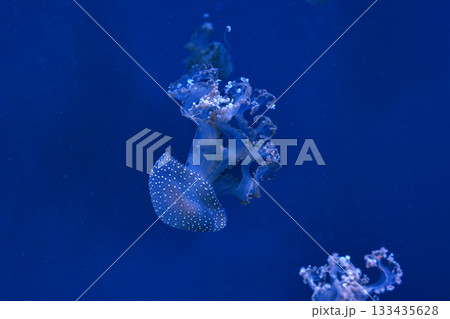 Group of Phyllorhiza punctata or Australian spotted jellyfish swim in deep blue water of aquarium