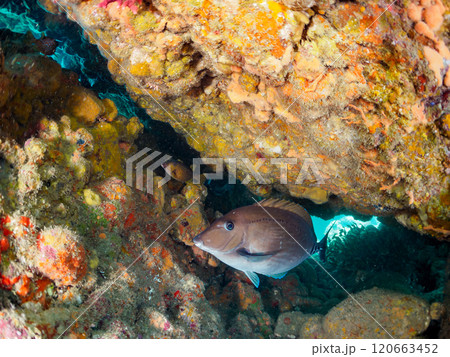 水中洞窟にいる、美しいイシガキフグ(ハリセンボン科)、ニザダイ(ニザダイ科)他の群れ。 ヒリゾ浜