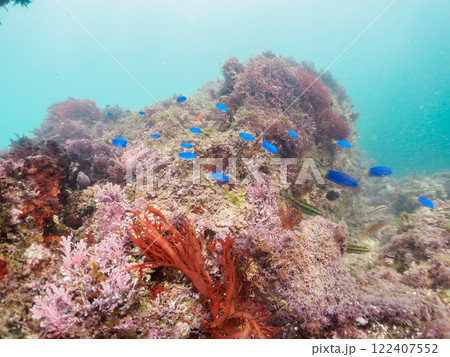 ホンダワラの森に集まる、美しいソラスズメダイ(スズメダイ科)他の群れ。神奈川県三浦市荒井浜 2024