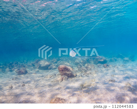 美しいツノダシ(ツノダシ科)の群れ。 水面にはスキンダイバーも泳いでいる。中木ヒリゾ浜-2024年