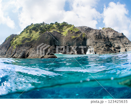 ヒリゾ浜渡船の漁船の美しい半水面撮影, 安全な水域から見ている。 船上にはダイバー達が乗っている。