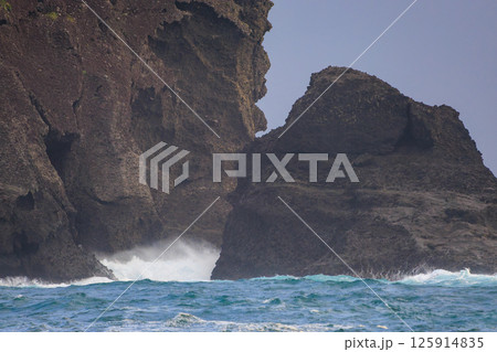 岩礁に当たる白波が美しいヒリゾ浜の青い海。 落ちそうで落ちない権力岩。ヒリゾ浜中木南伊豆町伊豆半島
