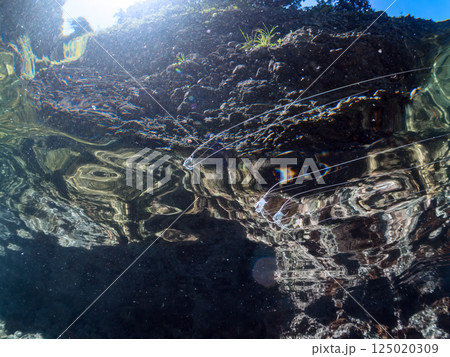 水面近くを泳ぐ美しいボラ(ボラ科)の群れの半水面撮影。 ヒリゾ浜中木南伊豆町伊豆半島静岡県2024