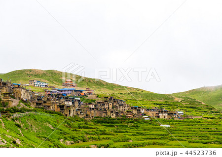 Green terraced fields and traditional architecture