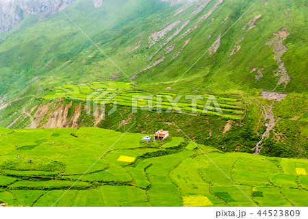 Morning sunrise with foggy agricultural mountain