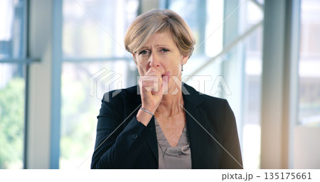 Portrait, infection and a business woman coughing in her office at work while looking sick with a virus. Health, covid and cough with a senior female manager or CEO standing alone in the workplace