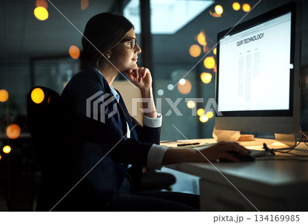 Night, computer screen or business woman reading research on network overtime on digital technology strategy. Late, lens flare or focused employee online for company deadline on internet in office