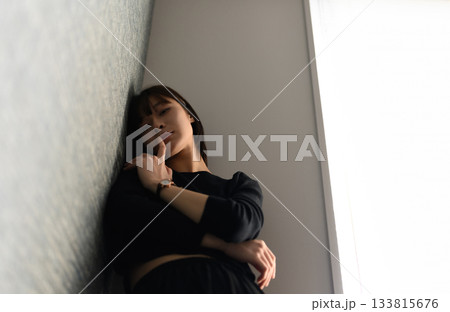 壁にもたれかかり、物憂げな表情を浮かべる若い女性