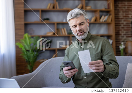 Mature man with grey hair holding a receipt while comparing details on his smartphone, managing personal finances, budget, and expenses from the comfort of his home office