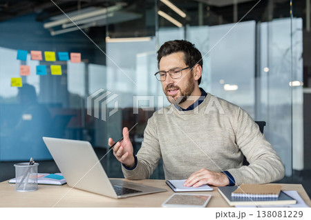 Professional man in smart-casual attire gesturing and speaking during an online video conference from a modern office, collaborating remotely on business strategy and projects