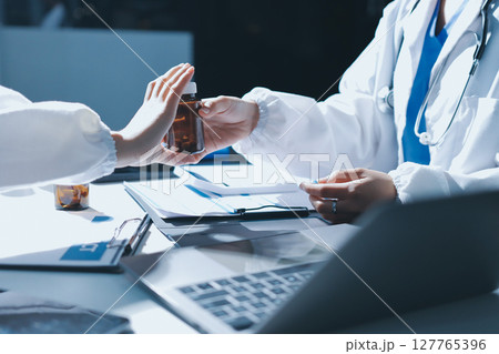 Male and female doctors are having a meeting in a hospital room.