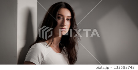 Young woman with long brown hair posing near white wall