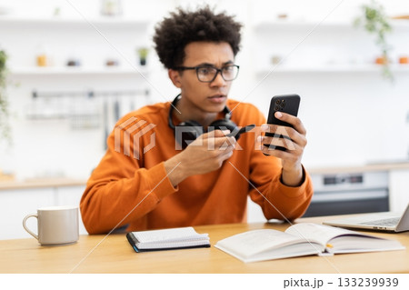 A young man with glasses is looking at his phone with a pen in his hand, sitting at a table with a notebook and coffee cup.
