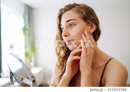 curly woman with rashes on her face is worried about the health of her skin. Dermatology concept.