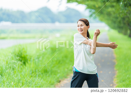 外でストレッチをする若い女性後ろ姿 外ヨガイメージ
