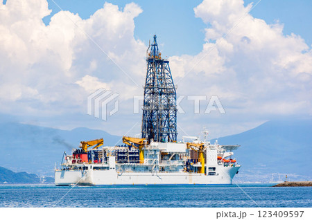 (静岡県)地球深部探査船「ちきゅう」が浮かぶ駿河湾越しに、富士山