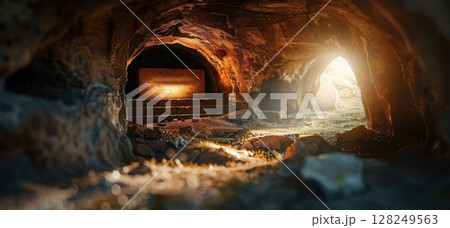Inside the empty tomb, the stone is rolled away, illuminating the scene with a divine light that signifies new beginnings.