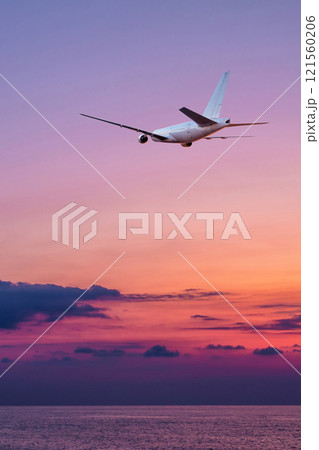 Passenger airliner is landing over the ocean against the backdrop of picturesque sunset sky