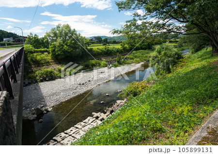 道の駅ゆのたに 物産館 深雪の里の裏の川沿い 夏晴れの青空 新潟県魚沼市吉田