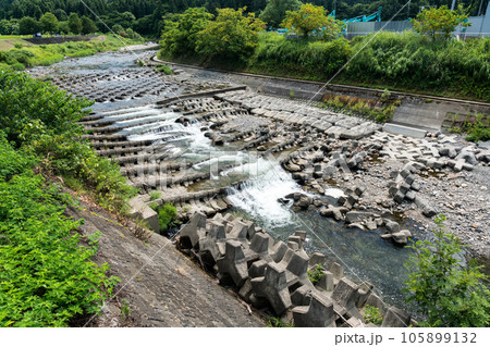道の駅ゆのたに 物産館 深雪の里の裏の川の流れ 夏晴れの青空 新潟県魚沼市吉田