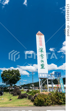 道の駅ゆのたに 物産館 深雪の里 巨大な看板 夏晴れの青空 新潟県魚沼市吉田